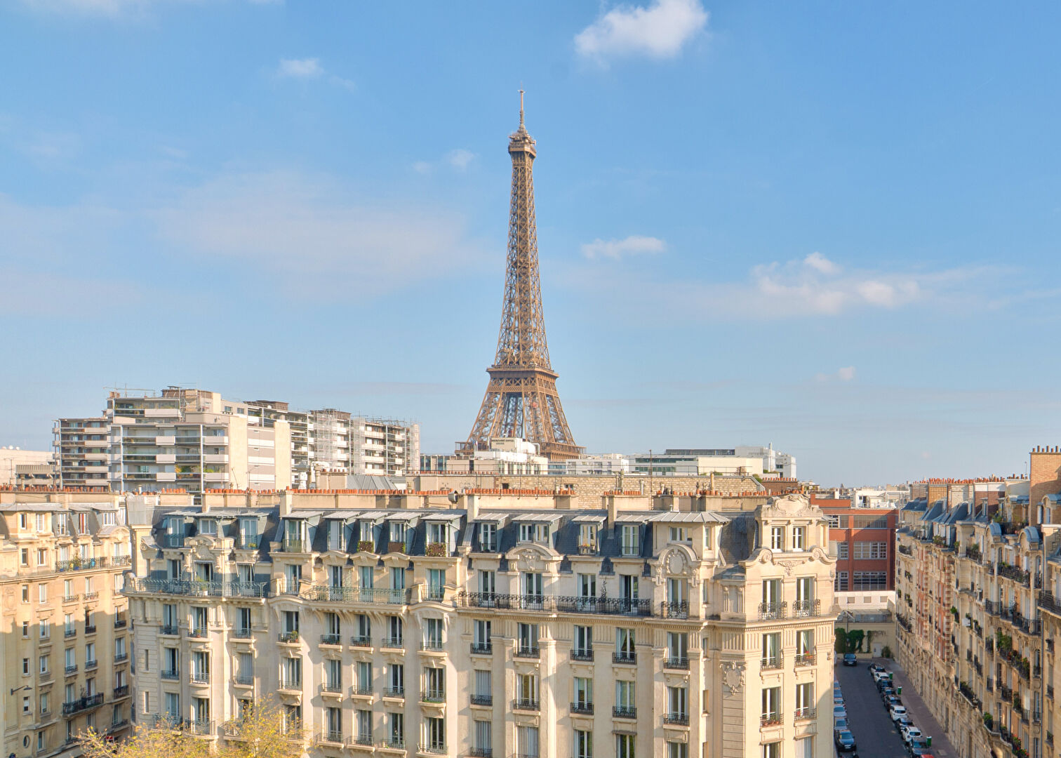 Superbe appartement de 63 m², situé au 7éme étage comprenant une entrée, un double séjour avec vue imprenable sur la Tour Eiffel, une cuisine, une chambre, une salle de bains et un WC.