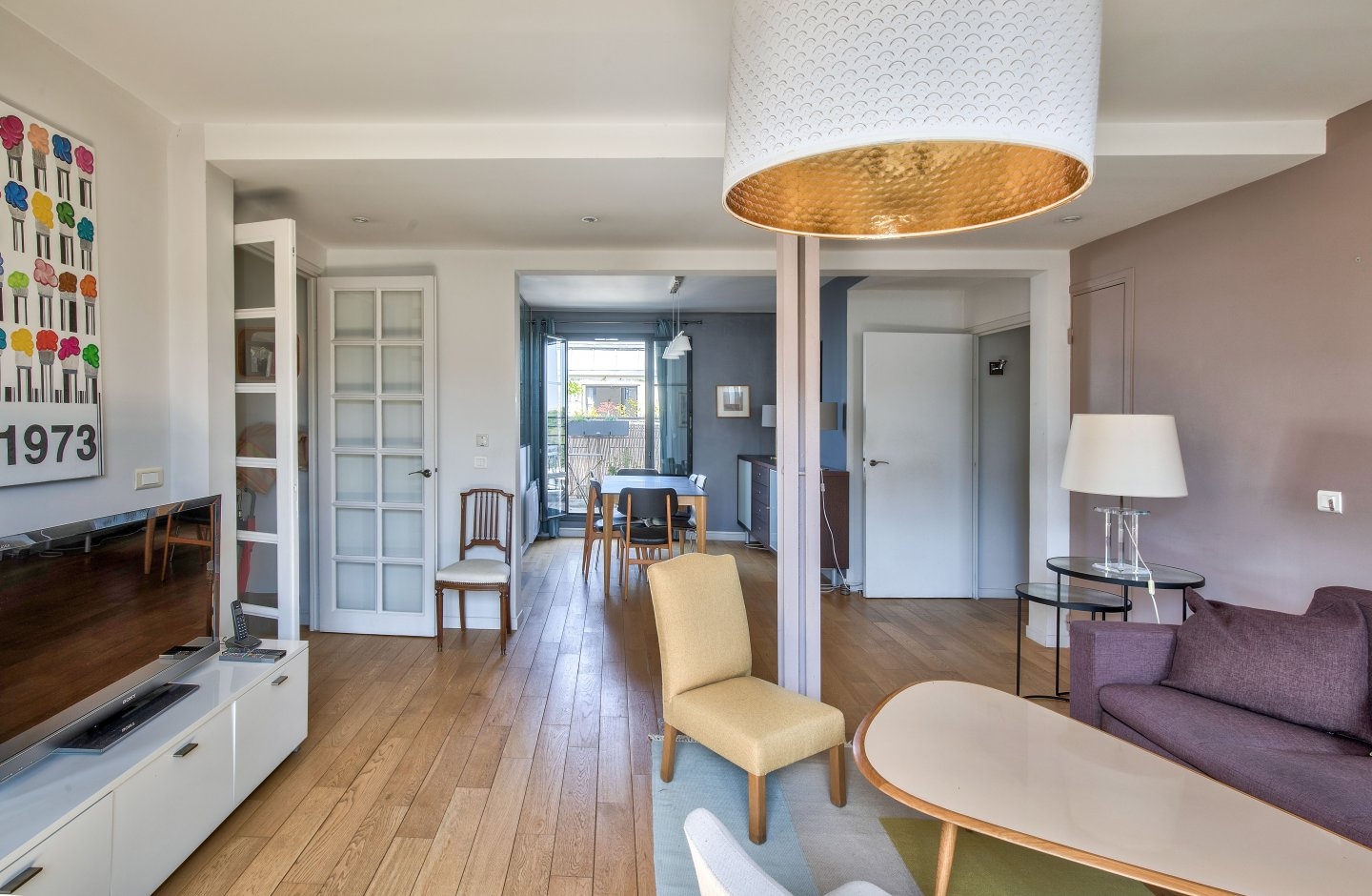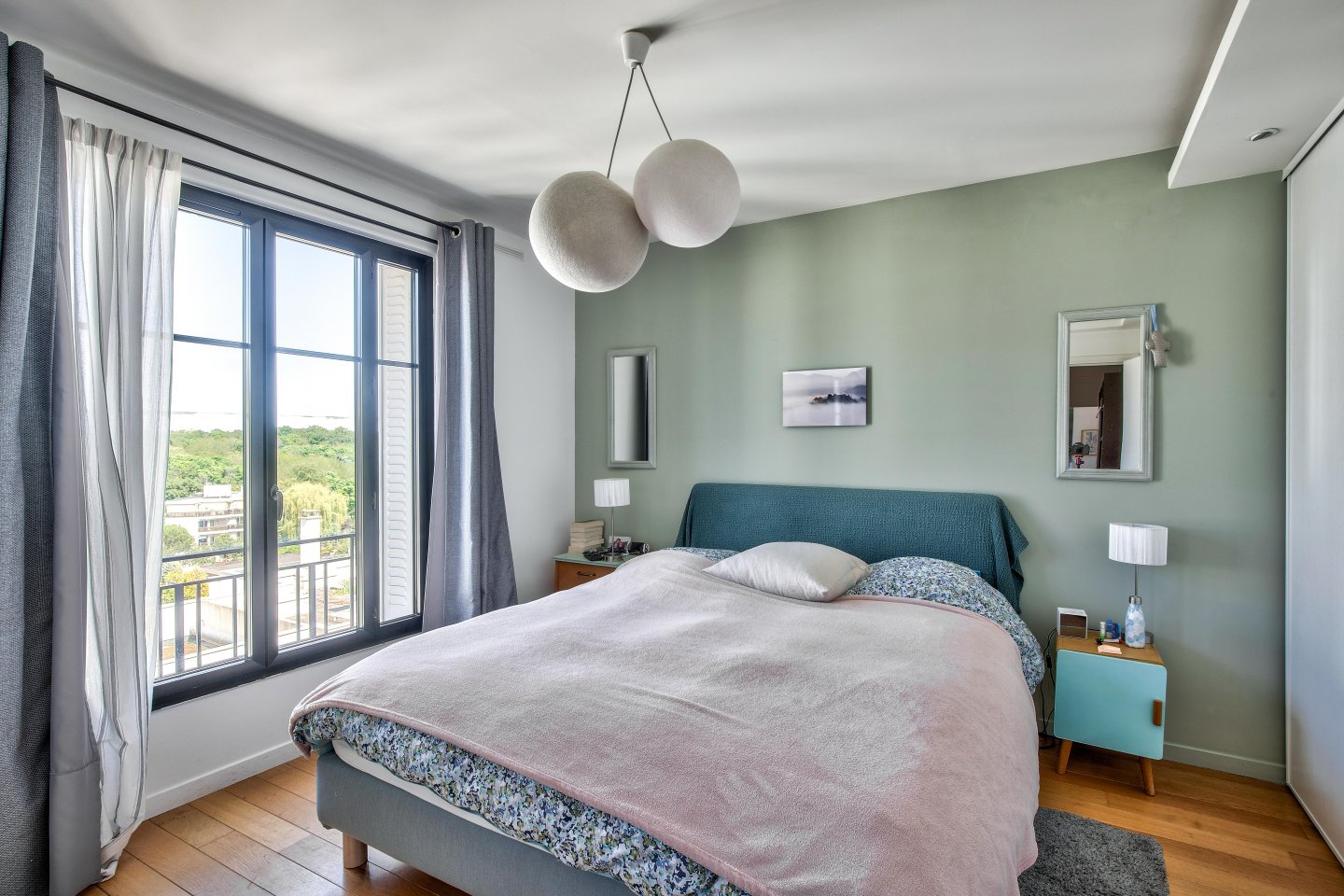 Au 7ème et dernier étage avec deux balcons, vue Tour Eiffel et vue dégagée sur verdure, situé dans un immeuble de standing sécurisé, appartement familial baigné de lumière, au calme, traversant de 4 pièces comprenant une entrée, une cuisine aménagée et équipée semi-ouverte sur un double séjour, trois chambres dont une suite parentale avec salle de bains et WC, une salle d’eau, des toilettes séparées et de nombreux rangements.