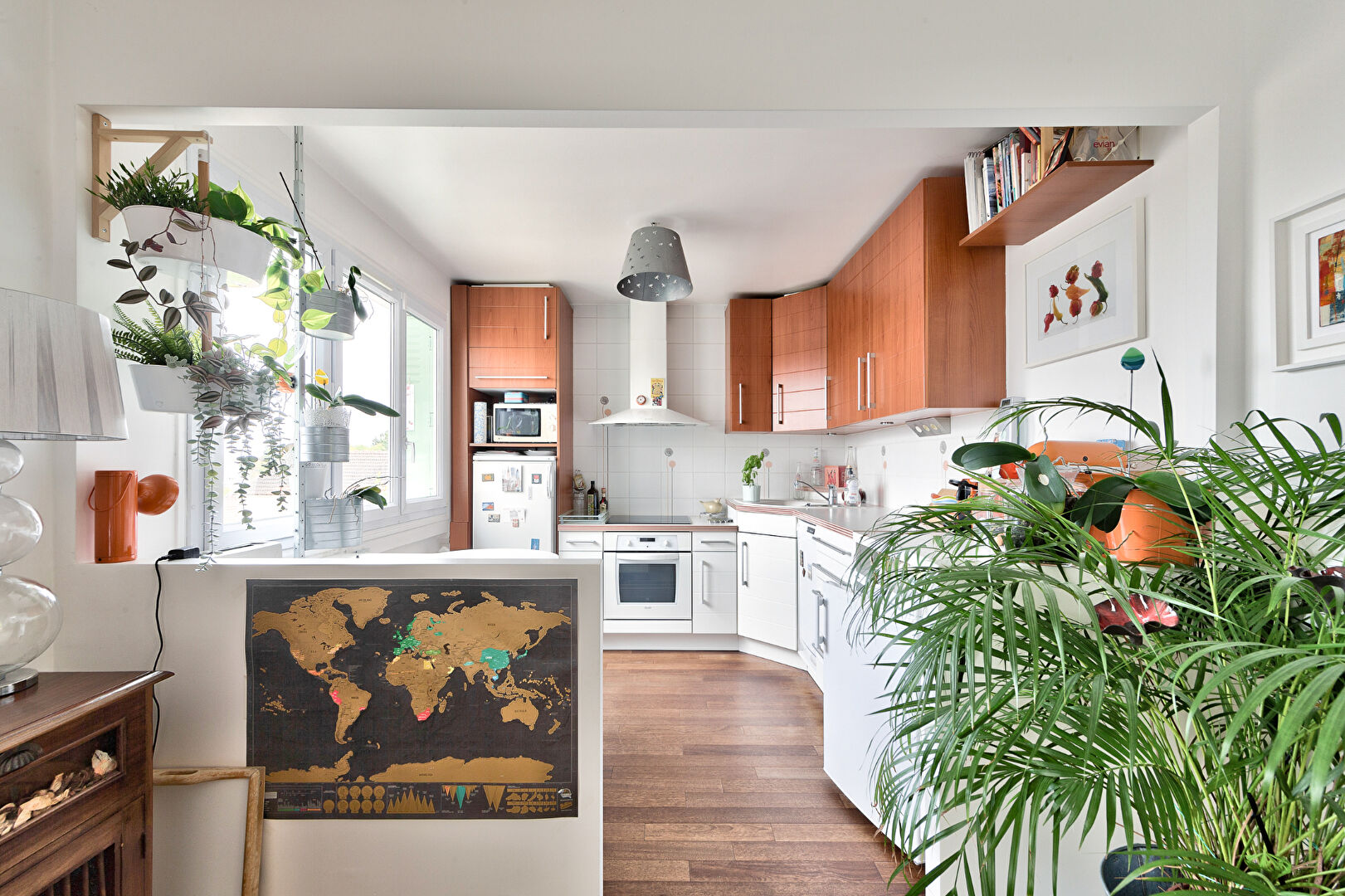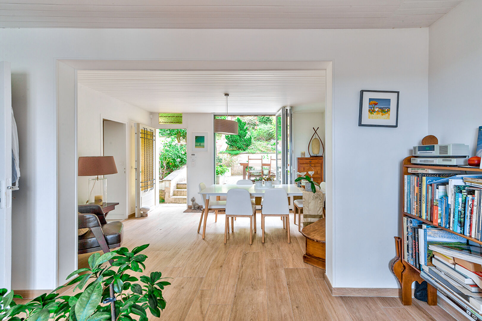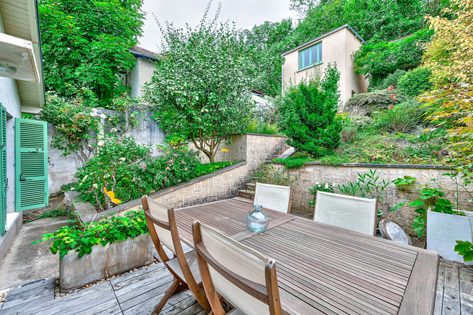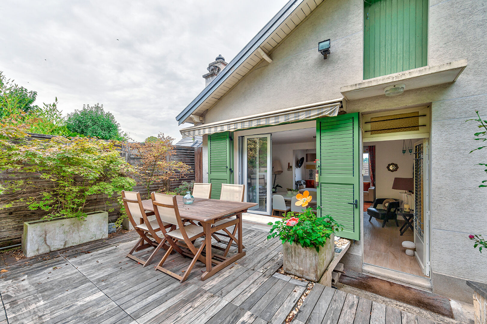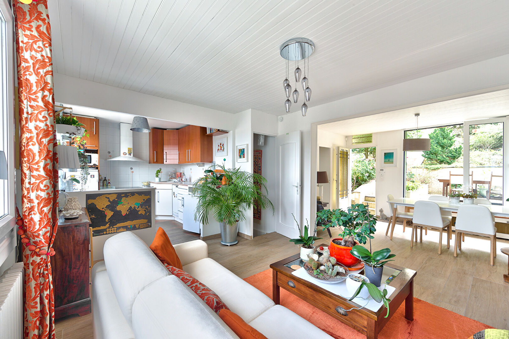 Au rez-de-jardin un séjour avec une double exposition Nord-Sud donnant sur une terrasse en bois à l’extérieur, une cuisine ouverte sur le séjour, une chambre d’ami.