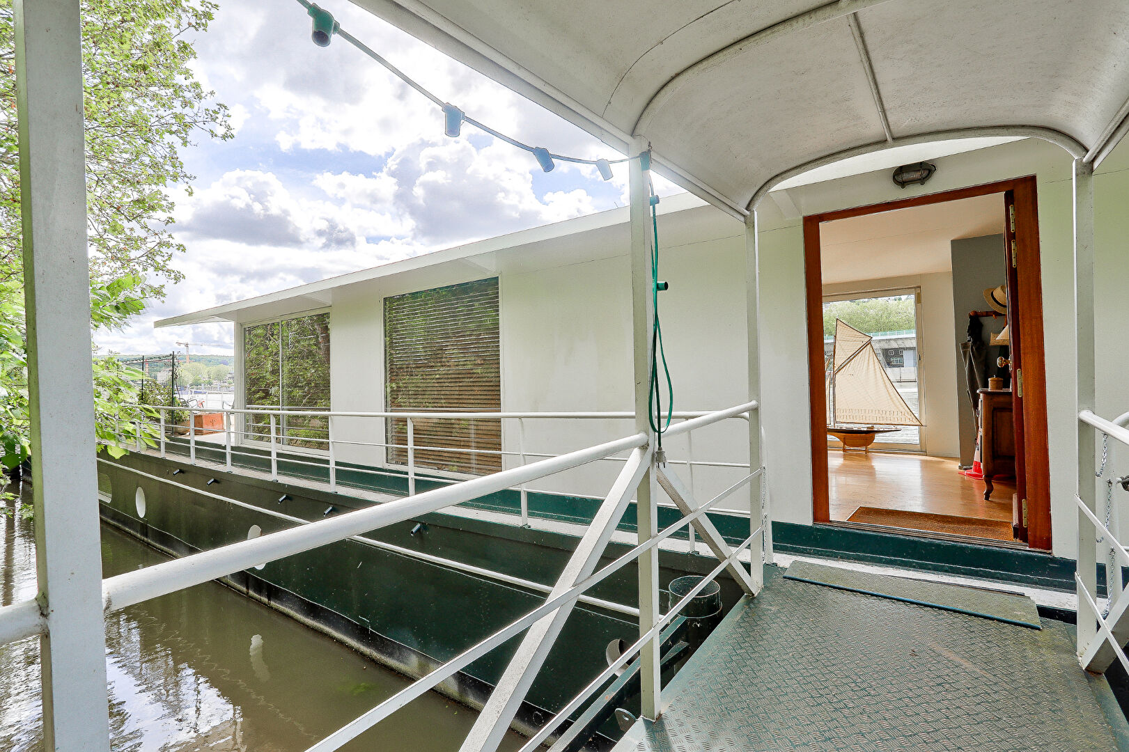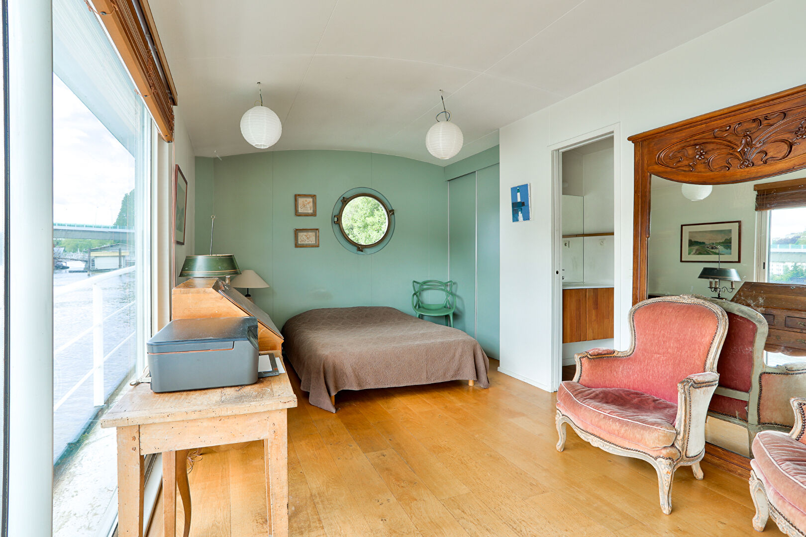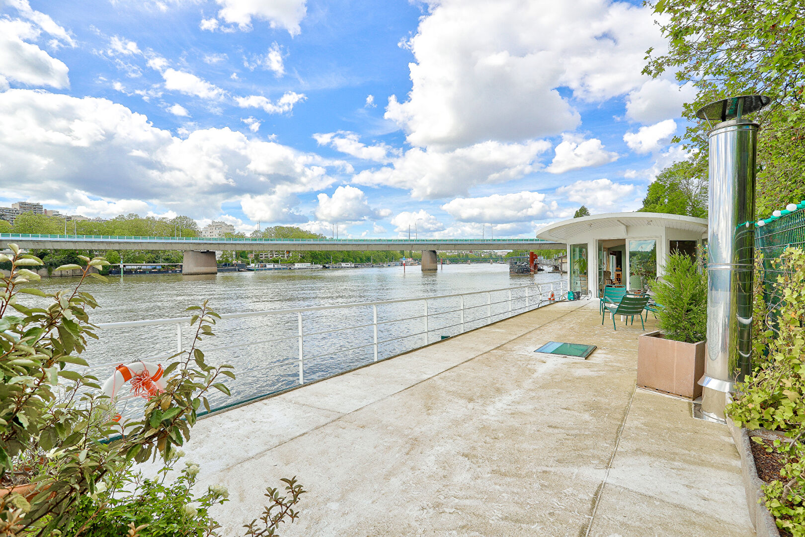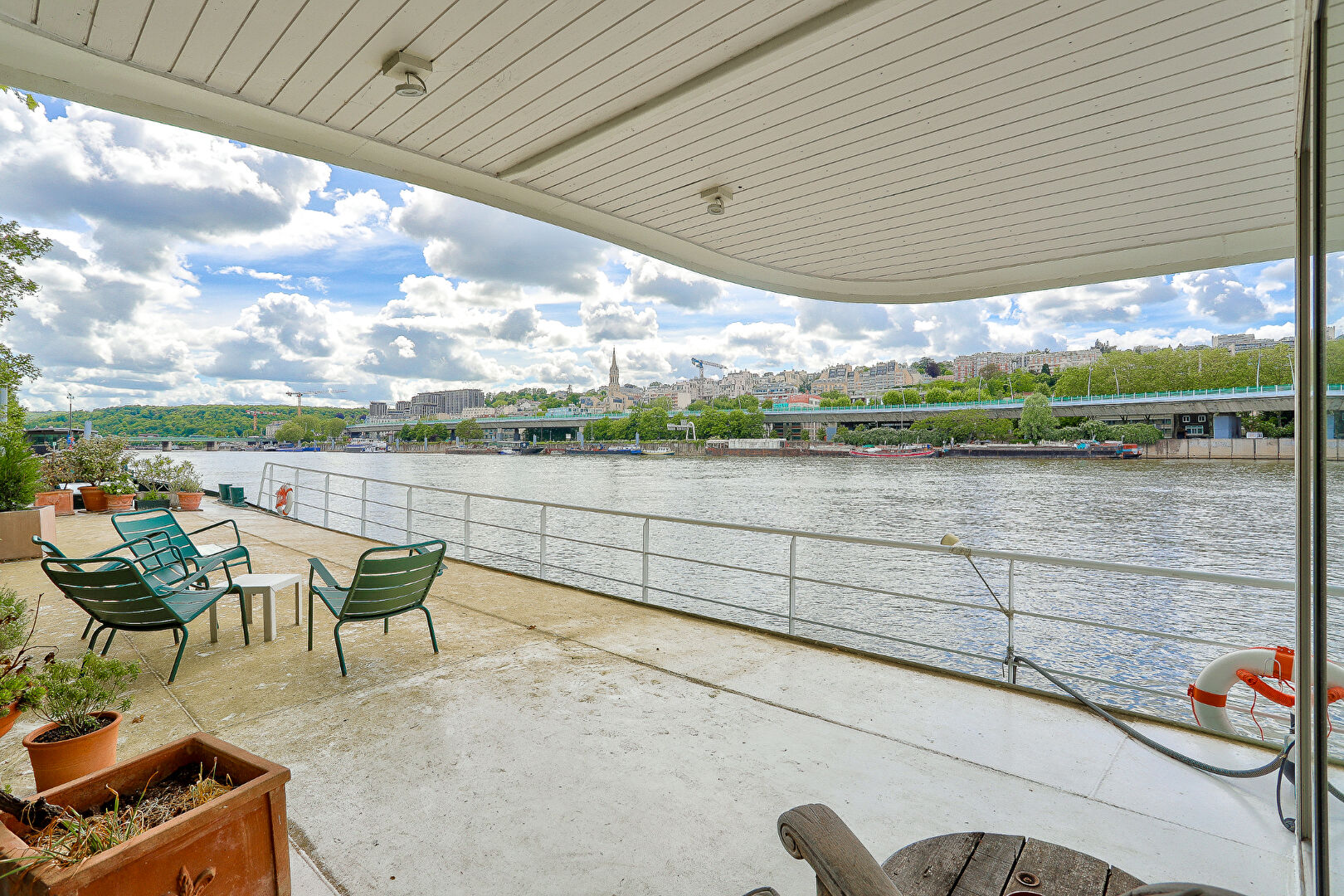 Sur le pont supérieur, un vaste salon de réception s’ouvre sur une terrasse de 50 m², offrant une vue imprenable sur le parc de Saint-Cloud. Une chambre avec salle de douche et des toilettes indépendantes complètent cet espace. L’étage inférieur révèle une belle pièce de vie baignée de lumière, où un salon avec poêle, une cuisine-bar et une salle à manger composent un ensemble chaleureux et convivial. Trois chambres, dont une traversante, ainsi qu’une salle de bains avec toilettes, confèrent à ce lieu une atmosphère intime et raffinée.